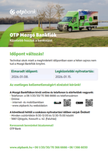 Technikai okok miatt az OTP Mozgó Bankfiók a korábban meghirdetett időpontban nem tud kinyitni.